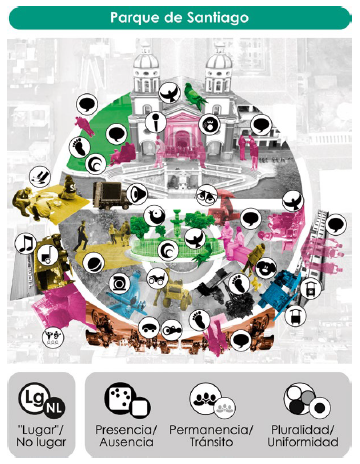 Por otra parte, en cuanto a la percepción sonora del lugar, el paisaje sonoro del parque de Santiago y su entorno urbano fluctúa entre el lugar y el no-lugar. Espacialmente, se divide en dos zonas: una parte alta, tipo montículo, donde se asientan la iglesia y su espacio adyacente, y una parte baja, donde se ubica el parque. Esta diferencia zonal se advierte sonoramente, pues en la parte baja predominan las antropofonías, cuyos matices son la estabilidad y la pluralidad; mientras, en el costado superior priman las ecotopofonías, la inestabilidad y la uniformidad. Estas diferencias son no solo espaciales, sino también, temporales; el paisaje sonoro muta en días entre semana, fines de semana y, mucho más, en días de eventos.