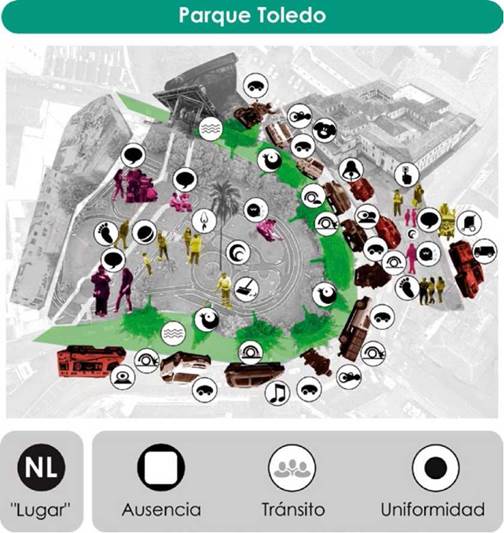 Por otra parte, en cuanto a la percepción sonora del lugar, el parque Toledo, en su generalidad, se destaca como un no-lugar. Al constituirse en parte del borde del centro histórico, presenta altos factores de desapropiación del espacio, hecho que se refleja en un espacio público que generalmente se encuentra vacío de interacciones y de un contexto activo, por lo cual genera una percepción de "ausencia" en la que predomina el fondo sonoro y no se presentan señales sonoras que rompan con la rutina del aparente silencio. Se concluye que el protagonismo de estos sonidos anodinos, comunes y homogéneos del parque Toledo dan información de su constante estado de no-lugar, lo cual lo constituye en un lugar para aquellos relegados socialmente, y que encuentran su refugio en la soledad y el anonimato de este espacio, tal como se indica en el collage de la figura 11.
