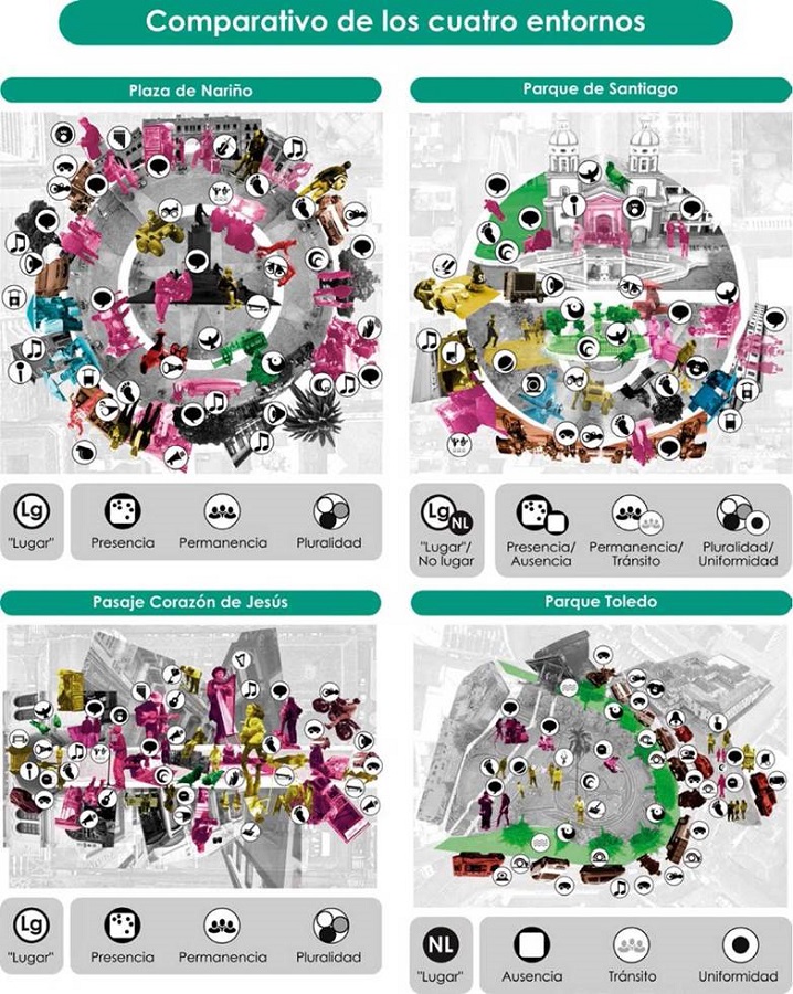 Al interpretar comparativamente los matices sonoros de cada uno de estos cuatro entornos urbanos a través de los collages que se muestran en la figura 12, y en los cuales se plasma la esencia de la actividad humana y biótica de cada espacio, se evidencia su contraposición. Mientras que en la plaza hay una confluencia continua de personas, eventos y micro eventos, en el parque Toledo, refugio de los habitantes de calle, se siente la presencia de la naturaleza en medio del tráfico urbano, entre la calma y la tensión, pasando por la melancolía, que lo vuelven todo un oxímoron; la sensación de abandono en medio de ese micropulmón verde tan anhelado en la ciudad; la soledad junto al río, que podría ser el elemento más deseable como configurador del espacio público en el centro histórico, pero relegado al olvido. Entre tanto, el parque de Santiago, testigo de las luchas históricas de la ciudad, presenta un carácter más cotidiano, donde ocurren esos microeventos aparentemente triviales del día a día; se ha constituido en un espacio más nocturno, como punto de encuentro de las generaciones más jóvenes. Este aspecto bohemio coincide con el carácter del pasaje Corazón de Jesús, en el que también se siente el rasgo de lo artístico y del comercio asociado a la magia y las creencias desde la sabiduría popular.