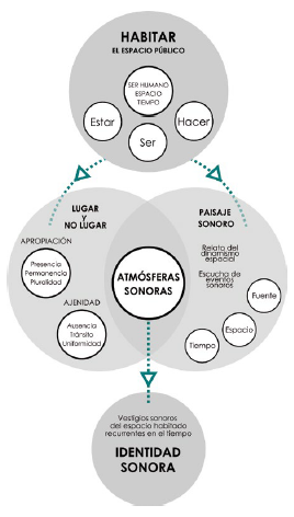 Dicho de ese modo, el concepto de atmósfera sonora se injerta como elemento primario que da indicio de la presencia, la permanencia y la pluralidad del ser humano, características de un espacio que se percibe como un lugar o, por el contrario, indicios de la ausencia, el tránsito y la uniformidad que advierten la llegada a un no-lugar, como se indica en la figura 2.