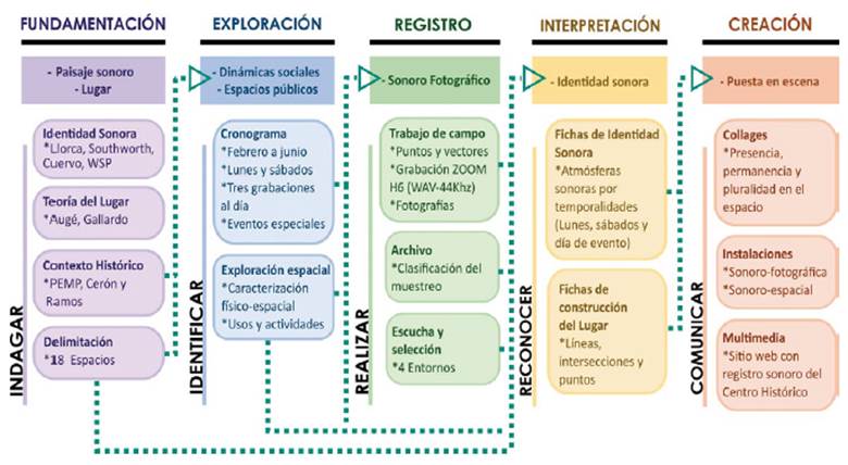 Interpretar un espacio como un lugar o un no-lugar desde las huellas de la identidad sonora implica adentrarse en cada entorno urbano, recorrerlo y permanecer en él. En consecuencia, después de la fase de investigación teórica se prosiguió a vivenciar el lugar llevando a cabo la captura del material sonoro, seguida por las fases de organización, de selección y de interpretación de las grabaciones obtenidas, ultimadas por la traducción gráfica de la percepción sonora del lugar, que desembocó en una etapa creativa, durante la cual se divulgaron los resultados, con el objetivo de provocar la concientización ciudadana sobre la cultura sonora y sus implicaciones urbanas, tal cual se expresa en la figura 3.