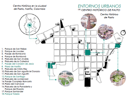 Se exploraron y se grabaron 18 entornos urbanos del centro histórico de Pasto (Calvachi et al., 2020a)1, que comprenden parques, pasajes, plazas y plazuelas. A partir de esa diversidad espacial se escogieron estratégicamente cuatro entornos urbanos para ser interpretados: de dichos espacios, fueron escogidos estratégicamente, para su interpretación, cuatro entornos urbanos, resaltados en la figura 4: el parque de Santiago, la plaza de Nariño, el pasaje Corazón de Jesús y el parque Toledo, por cuanto permiten generar un contraste más notorio en cuanto a lugar y no-lugar se refiere.
