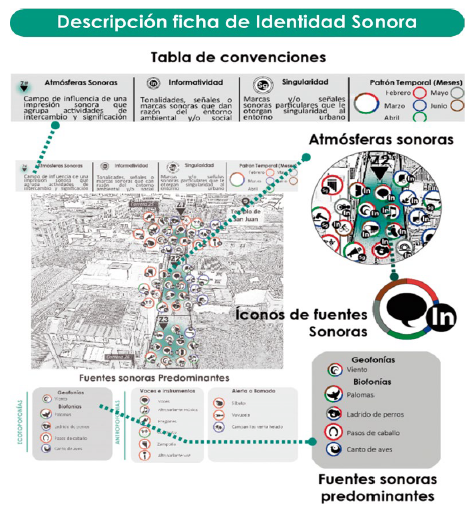 Para el diseño de las fichas de identidad sonora se tomaron pautas de investigaciones previas sobre sonido, como las que se evidencian en el caso del paisaje sonoro del barrio San Nicolás, en Cali (Llorca, 2017).