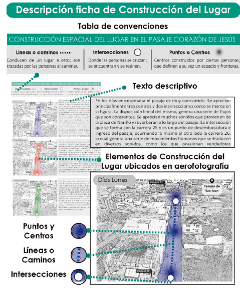 En este tipo de fichas se inquiere acerca de las interacciones humanas que construyen el lugar, y que se hacen evidentes al seguir las huellas de los actores urbanos en el espacio público. Dichos trazos se observan a través de líneas, dibujadas por las personas al caminar en la ruta seguida para ir de un lugar a otro. Cuando estas personas se cruzan, se encuentran y se reúnen, crean las intersecciones. Y cuando tal suceso es recurrente en el tiempo y en el espacio, denota los puntos, que definen, a su vez, un espacio y unas fronteras (Augé, 1992, p. 33).