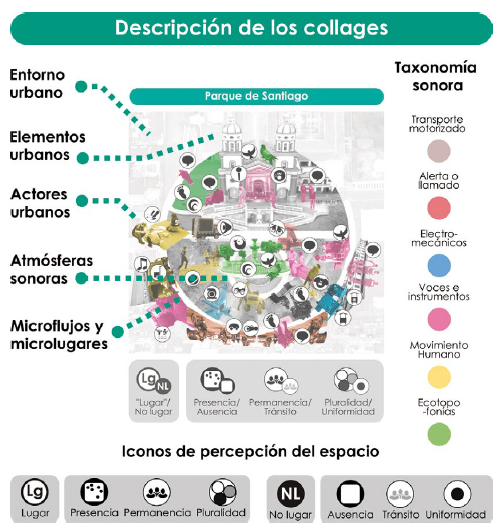 La base gráfica del collage se conforma mediante la imagen del espacio urbano, comprendida desde su accesibilidad o su permeabilidad, según lo cual se constituye en posibilitadora de los microflujos y los microlu-gares, mientras que los segmentos en el interior de la base gráfica separan las atmósferas sonoras, a manera de territorios perceptuales. Sobre esta base gráfica aparecen edificaciones o elementos urbanos protagonistas que configuran el espacio, acompañados por recortes fotográficos de los ciudadanos que interactúan con el entorno, y cuya dimensión ha sido modificada intencionalmente, indicativo de su protagonismo en la escena urbana. De igual manera, se hace uso de la opacidad de la imagen, para señalar la estabilidad espaciotemporal de los actores urbanos o, por el contrario, su fluctuación. Por otra parte, a la fotografía de cada actor se le aplica un filtro de color, que representa cada una de las categorías taxonómicas de las fuentes sonoras y se complementa con un ícono de la fuente sonora correspondiente. De esta manera, se advierte sobre la diversidad o, por el contrario, la uniformidad de las atmósferas sonoras existentes en cada entorno urbano, además de esclarecer el carácter o la esencia propia de cada espacio que lo torna singular y lo distingue de los otros entornos urbanos.