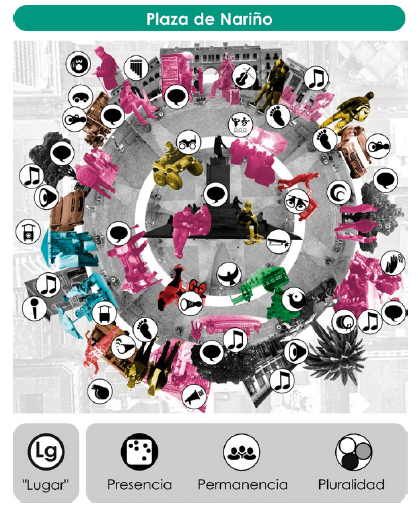 Por otra parte, el paisaje sonoro de la plaza de Nariño y su entorno urbano, en cuanto a la percepción sonora del lugar, es testigo de la continua presencia humana: la plaza manifiesta, sonoramente, una riqueza social y cultural que puede llegar a ser caótica. Contra todo pronóstico, esta misma sensación abrumadora garantiza la presencia de personas, lo cual ofrece una sensación de seguridad y de compañía, en contraste con espacios muy silenciosos a los que en el imaginario urbano se percibe como peligrosos. Si bien la plaza puede lucir descuidada en cuanto a su mobiliario y su vegetación, es el refugio de una cantidad de personas que buscan un lugar para descansar o pasar un rato, solos o en familia. Algunos personajes incluso se han vuelto comunes al imaginario de la ciudadanía por su presencia reiterativa al ocupar un mismo lugar, lo cual resalta la estabilidad espacial y temporal de este espacio al ser habitado.