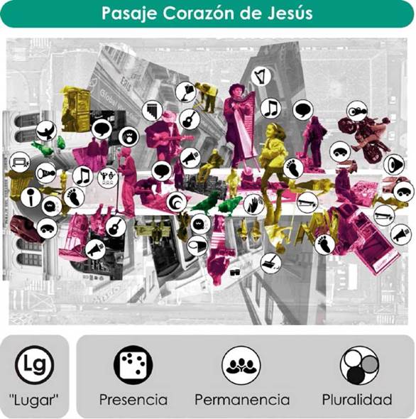 Por otra parte, en cuanto a la percepción sonora del lugar, el pasaje Corazón de Jesús, en su generalidad, tiene característica de lugar. En este espacio, el flujo de peatones es constante, y también las permanencias se evidencian. Las actividades, tanto en días entre semana como en fines de semana, son una constante, a diferencia del lunes festivo, cuando dichas características de relacionalidad se minimizan. Este espacio se encuentra aislado del constante sonido del tráfico vehicular que se aprecia en el centro histórico, lo cual permite percibir un paisaje sonoro en el que predominan los sonidos cercanos y peatonales. Por otro lado, se apreciaron durante los meses de grabación varias actividades de carácter cultural, por la presencia allí de transeúntes que deciden realizar presentaciones musicales a manera de conciertos urbanos; se generan, de esta forma, cambios en la atmósfera general de todo el pasaje. Su configuración de eje lineal permite escuchar sonidos de extremo a extremo. El collage que se muestra en la figura 9 retrata la percepción sonora de este espacio público.