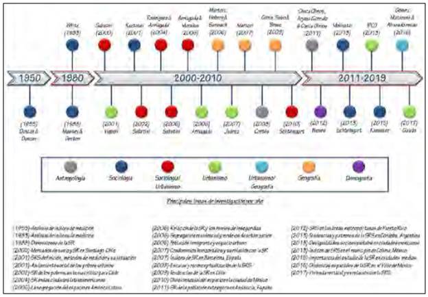 A pesar de que la segregación es un tema que desde siglos atrás se ha venido estudiando, es a partir de la mitad del siglo XX cuando el interés en su análisis adquiere mayor magnitud. Esto, debido a las rápidas y constantes modificaciones urbanas, sociales, políticas, económicas, tecnológicas, y hasta culturales, que comenzaron a experimentar las ciudades, lo cual causó la reorganización de las estructuras sociales dentro del territorio urbanizado e, incluso, abarcando el no urbano, como se muestra en la Figura 1. Línea cronológica de los principales estudios realizados sobre segregación (divididos por disciplina).
