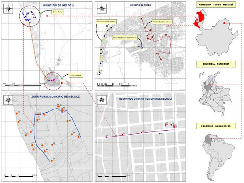 Para la primera estrategia se estableció un sistema de recorrido por zonas, partiendo de lo micro (locales comerciales y viviendas) a lo macro (Plazas de mercado) en el municipio de Turbo. La primera zona correspondió a la zona urbana (micro), la segunda a la zona costera de Playa Dulce (micro), y la tercera en los centros de mercado (macro), como la plaza de mercado de Turbo y la zona de comercialización de pescado comúnmente conocida como waffe. Sin embargo, en el recorrido al municipio de Necoclí, la toma de datos se realizó de manera inversa, debido a cuestiones de movilidad y acceso a las zonas de estudio urbanas y rurales, que correspondían a viviendas y locales comerciales. La localización de los espacios arquitectónicos visitados durante el proceso de recolección de información se muestra en la figura 1.