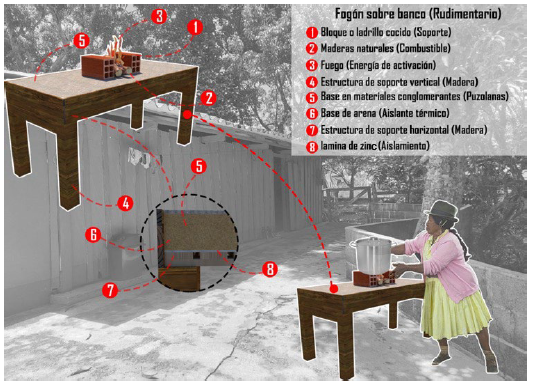 Con respecto a las dos tipologías restantes de fogones encontrados en comunidades afrodescendientes, fue posible evidenciar el fogón de banco con estructura en madera y biocombustible en leña, principalmente en las comunidades rurales del municipio de Necoclí. En comparación con los dos fogones mencionados, este presentaba una estructura de soporte en madera con una altura en promedio de 0.85m, lo cual garantiza mayor comodidad en cuanto a los perfiles posturales durante la transformación y la cocción de alimentos (Fonseca, 2021). Los componentes y la materialidad de esta tipología de fogón se muestran en la figura 5.