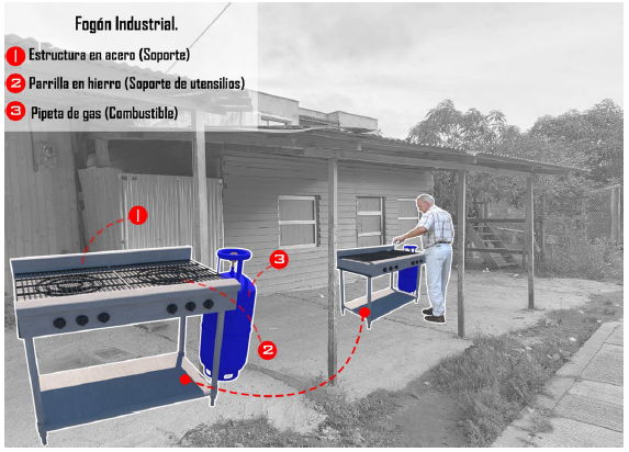 Por último, se encuentra el fogón industrial de gas o eléctrico, el cual es implementado de manera recurrente en las zonas urbanas. Esto se debe a la optimización de los tiempos de cocción de los alimentos y a la no utilización de leña como combustible. Cabe resaltar que esta tipología de fogón se instala al interior de la edificación, a diferencia de los anteriores fogones, que se utilizan externamente. Las partes y la materialidad de esta tipología de fogón se muestran en la figura 6.