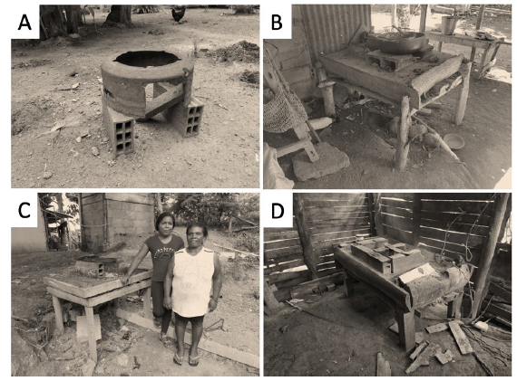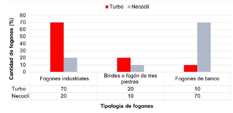 Cabe resaltar que, aunque en el municipio de Turbo se implementan de manera más frecuente los fogones industriales, 30% de las personas afrodescendientes aún utilizan fogones tradicionales soportados sobre piedras o ladrillos y fogones de banco con estructura en madera. Esto es consecuencia de la tradición gastronómica relacionada con el uso de la leña como combustible durante el proceso de cocción de los alimentos. Algunas de las tipologías de fogones encontrados en el municipio de Turbo se muestran en la figura 8.