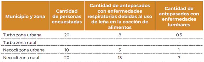 En la tabla 1 se muestra la relación existente entre el uso del fogón en leña y la presencia de enfermedades respiratorias y problemas lumbares presentes en los antepasados de las personas afrodescendientes del caribe colombiano estudiadas en esta investigación, de acuerdo con los datos que arrojaron las encuestas con las que se les indagó.