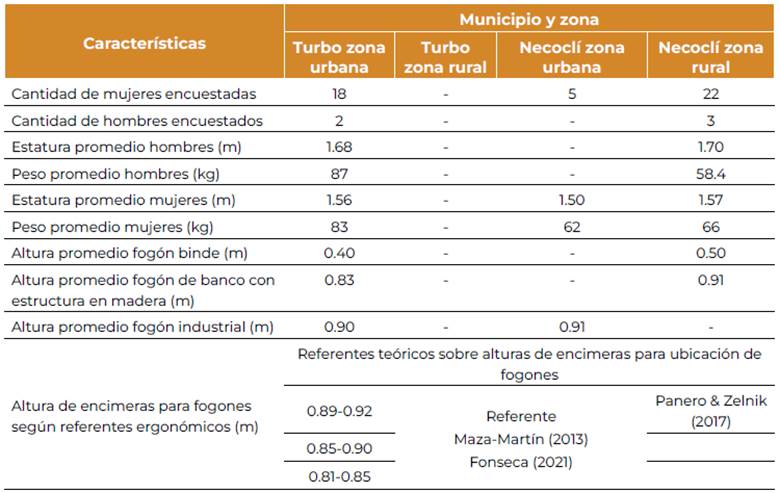 Para este punto, se procedió al análisis ergonómico mediante la toma de dimensiones antropométricas de los cocineros y cocineras afrodescendientes. Esta información se relacionó con las medidas de los fogones presentes en cada una de las zonas rurales y urbanas de los municipios de Necoclí y Turbo, como se muestra en la figura 11. El análisis se centró en las dimensiones que deben tener los fogones como componente de las cocinas de acuerdo con los referentes teóricos relacionados con la ergonomía y su articulación con los objetos, tal como se muestra en la tabla 2.