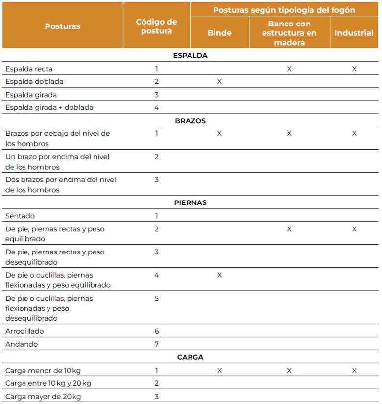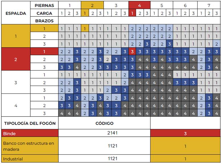 Para este estudio se estableció una clasificación de posturas con una asignación de códigos correspondiente a una serie de valores para cada una de las partes del cuerpo analizadas. La espalda correspondió al código 1, los brazos al código 2 y las piernas al código 3, además de un código 4 para la carga levantada. Para cada postura se asignan cuatro niveles de riesgo, teniendo en cuenta que la espalda corresponde a cuatro posturas, los brazos a tres y las piernas a siete. Además de lo anterior, se estableció una codificación asignada para las cargas levantadas mientras se realizan las diferentes actividades culinarias, donde un código es 1 si se tienen menos de 10kg, 2 si es entre 10 kg y 20 kg, y 3 si es más de 20 kg (Muñoz & Velasco, 2015). En la Tabla 4 se muestran los códigos para determinar las categorías de riesgo en relación con las actividades culinarias desarrolladas y las posturas implementadas durante la utilización de las diferentes tipologías del fogón.