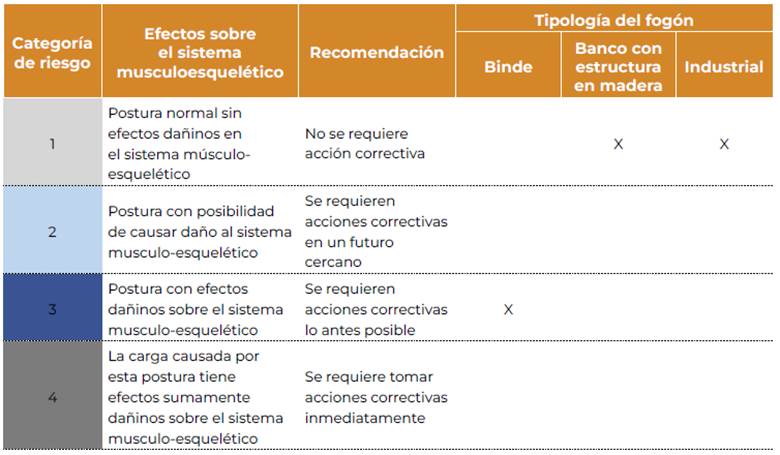 Una vez analizadas las posturas y determinados los códigos en relación con las actividades en torno a las tipologías del fogón, según la tabla 3, se obtuvieron el código 2141 para el Binde y el código 1121 para el fogón de banco con estructura en madera y el fogón industrial. Con estos códigos se procedió a medir el riesgo mediante el uso de la tabla 4, a través de la intersección de códigos y la correlación de la información obtenida en los procesos de observación de posturas. En la tabla 5 se establecieron los efectos sobre el sistema musculoesquelético en relación con las posturas derivadas del uso de las tipologías del fogón y las recomendaciones.