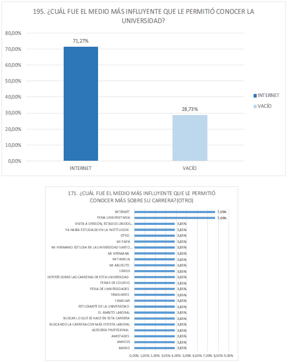 Dadas las condiciones actuales, se evidencia que la mayoría de los estudiantes en diversos niveles educativos utilizan internet como una herramienta tanto para obtener información como para comunicarse entre sí. Además, se observa que, en segundo lugar, se emplean elementos físicos tangibles, como ferias, entre otros, como un medio de orientación proporcionado principalmente por las instituciones educativas, en lugar de ser una iniciativa propia del estudiante. Esto sugiere que vivimos en una sociedad tecnológica donde se aprovechan las herramientas disponibles para facilitar procesos informativos y simplificar tareas tediosas (figura 1).