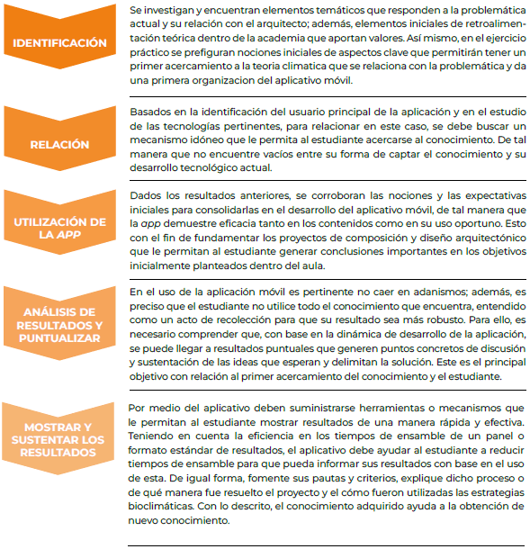Elementalmente, una app es un software que se instala en un dispositivo móvil que optimiza o ayuda al usuario a desempeñar procesos o actividades mecánicas, ya sea para su disfrute o para su trabajo. Existe una gran cantidad tipológica de aplicaciones que varían según su complejidad; en este caso se planteó una aplicación básica de consulta, interacción y clasificación como acercamiento al contenido teórico de la arquitectura bioclimática que no genere confusiones sobre su uso y, por consiguiente, evitar su obsolescencia a futuro.