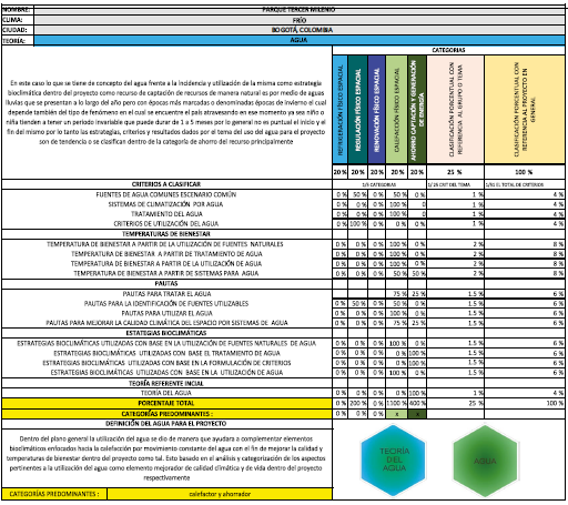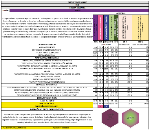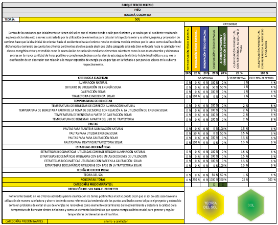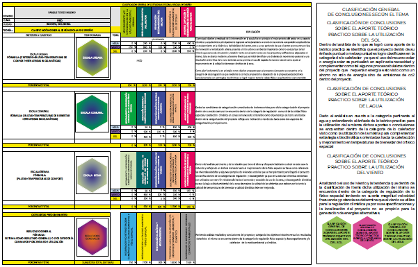 Una vez se han diligenciado todos los capítulos y los ítems correspondientes, la finalidad de este proceso es generar una matriz de resultados a partir de la estructura inicial. En esta matriz se expresan los resultados generales por porcentajes, junto con la correspondiente categorización e identificación de los énfasis climáticos de los proyectos analizados. Esto permite identificar fortalezas e indicadores de mejora en los que el proyecto podría trabajar en el futuro. Así, se obtiene una visión general de los parámetros bioclimáticos utilizados en el proyecto y, por consiguiente, una serie de conclusiones del estudiante. Este enfoque permite al usuario gestionar la información de manera organizada y contar con elementos de respaldo para la sustentación de sus resultados, como se muestra en las tablas 4 a 9.