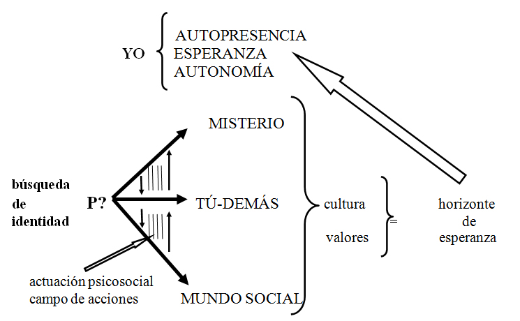De este proceso personal, propio y único, devenimos quienes vamos siendo: autopresencia, esperanza, autonomía, en el aquí y ahora de nuestro presente, actuando en la trama de relaciones interpersonales, en el ambiente social en que cada uno/una está inmerso. Este entramado está reflejado en el dibujo como el campo de acción donde la persona concreta en su actuación se responde quién es y está llamada a ser. Así lo indican las flechas de la izquierda que parten del yo al tú/demás y mundo social: cada persona “en el proceso de apropiación transforma el regalo de su identidad en una tarea”.31