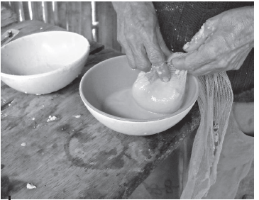 Ces plantes sont communément et principalement connues des femmes qui les choient en les arrosant périodiquement avec un peu de bière de manioc9. Les tubercules écrasés de sena’m .Xanthosoma sp. ou Maranta sp., une Marantaceae aux longues feuilles ovales bigarrées de rayures bleutées) sont cuits jusqu’à l’obtention d’une préparation crémeuse qui est refroidie avant d’être filtrée à l’aide d’un linge (fig. 3). Le résidu emprisonné dans le tissu est étalé dans un récipient qui est exposé au soleil. Une fois sec, une fine poudre est recueillie en raclant doucement le support sur lequel elle s’est agglomérée. Elle est rassemblée dans un petit tube de bambou afin d’y être conservée. Cette poudre est utilisée de différentes manières dans le cadre d’un rituel durant plusieurs jours. Afin d’attacher les vitalités des personnes, le couple s’en frictionne le corps avant de dormir. Une petite quantité est aussi déposée discrètement à l’entrée du vagin avant l’acte