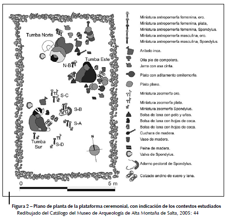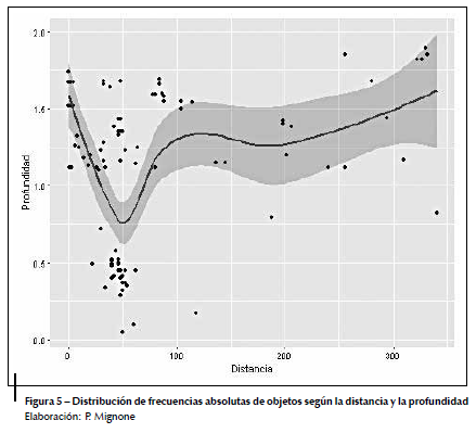 Los objetos de uso personal, como las bolsas que contienen uñas, pelos y alimento, así como la vestimenta y los accesorios (calzados, collares, penachos y vinchas), fueron depositados a corta distancia de los cuerpos en las tumbas (de 0 a 0,68 m), mientras que los objetos suntuarios, como las miniaturas antropomorfas y zoomorfas, se encuentran mayoritariamente en espacios de ofrendas fuera de ellas y a distancias mayores que el intervalo anterior (fig. 5).