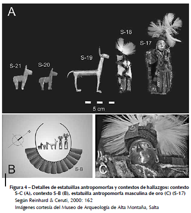 Por último, un próximo estudio etnohistórico podría indicar la significancia cultural de la diferencia entre las estatuillas antropomorfas, con vestimenta y adornos claramente incaicos (Abal, 2010), y los niños, que por el contrario, llevan vestimenta, peinados y adornos propios de sus lugares de origen (cuenca del Titicaca, según Abal, 2010: 229-236).