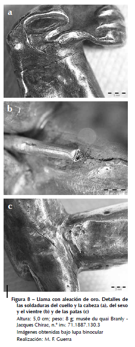 La estatuilla de llama de la colección (n.° inv. 71.1887.130.3), fue realizada de la misma manera que la estatuilla masculina de oro. La cabeza, las orejas, el cuello, las patas, el cuerpo, la cola, el sexo y las pezuñas fueron obtenidos enrollando láminas que luego fueron soldadas entre sí (fig. 8). El detalle anatómico está enfocado en la cabeza del animal y en particular en su hocico, que es la parte mejor trabajada desde este punto de vista.