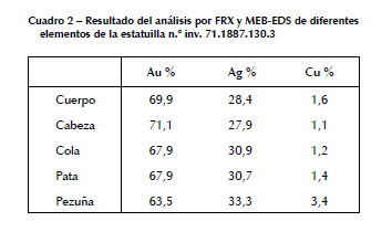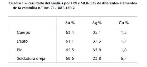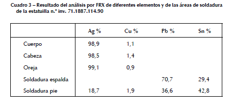 El análisis por FRX (cuadro 2) de diferentes elementos de la estatuilla revela la utilización de aleaciones que también contienen una alta concentración de plata. La composición de las láminas utilizadas para elaborar los pies de la estatuilla presenta un porcentaje más elevado de cobre; esto evidencia que se trata de una aleación diferente.