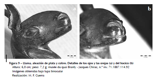 Entre los objetos de la colección Lemoyne se encuentra también una estatuilla de llama de plata (n.° inv. 71.1887.114.92) que responde a las mismas características estilísticas y tecnológicas que la estatuilla anterior (n.° inv. 71.1887.130.3), pero cuyos detalles del repujado del hocico, de los ojos y de las orejas son de mejor calidad, como se puede observar en la figura 9. El análisis por FRX de la estatuilla revela la utilización de aleaciones plata-cobre de muy buena calidad, con un tenor en plata que varía entre 98 y 99%. También se han observado aleaciones de plata de muy buena calidad en el caso de otras estatuillas (véase discusión en Vetter Parodi & Guerra, en este volumen) y, en particular, en las estatuillas provenientes de la Isla de Coati (Lago Titicaca, Bolivia), que pertenecen a la colección del Ethnologisches Museum de Berlín (Guerra et al., en este volumen), de San Jerónimo en Cuzco, que pertenecen a la colección Larrea del Museo de América de Madrid (Rovira Lloréns & Gómez Ramos, 1995) y de Paucartambo, que pertenecen a la colección del Museo Inka del Cuzco (Sierra Palomino & Guerra, en este volumen).