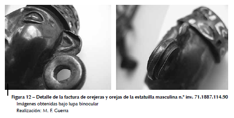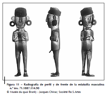 La radiografía de la pieza (fig. 11) confirmó, sin embargo, una fabricación conforme a la práctica inca, cuyo ensamblado es idéntico al de la estatuilla masculina (n.° inv. 71.1887.130.2) de oro. Únicamente las orejas son distintas: en el caso de la estatuilla de oro, descrita anteriormente, las orejas se fabricaron de forma independiente (alambre de sección cuadrada soldado a la cabeza) con el lóbulo trabajado en repujado. En esta última, en cambio, las orejas fueron realizadas a partir de una chapa recortada para soportar ornamentos circulares, también de fabricación independiente (fig. 12).