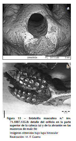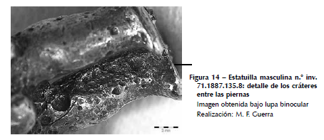 La estatuilla masculina (n.° inv. 71.1887.135.8; fig. 1) corresponde a un tipo de producción bien afianzado del Horizonte Tardío (1450-1532 d. C.) que se distingue claramente —desde el punto de vista estilístico— de las estatuillas presentadas anteriormente. Muestra a un personaje masculino que sostiene cinco mazorcas de maíz con un ademán de presentación o de ofrenda. Junius Bird relaciona a este personaje con un bailarín o un participante ceremonial (Bird, 1979: 51). El hombre está de pie con las piernas levemente flexionadas, la mirada hacia adelante, el rostro neutro. Pareciera que lleva taparrabos, en la cabeza se ve un tocado trilobulado y su espalda está recubierta con motivos vegetales en los que se distinguen mazorcas de maíz a la altura de la nuca. La estatuilla tiene un orificio en la parte superior de lacabeza donde se sitúa la extremidad del tocado (fig. 13a) que parece haber sido realizado en el molde de fundición como el resto de los detalles de la decoración. En el área contigua al orificio se pueden observar huellas de abrasión que podrían deberse a la fricción. Asimismo, en otras partes de la estatuilla, por ejemplo en las mazorcas de maíz, pareciera haber cierta abrasión por fricción (fig. 13b). La estatuilla fue elaborada por fundición. No se perciben líneas de juntura de moldes múltiples, como es el caso de un ejemplar del American Museum of Natural History de Nueva York, realizado a partir de un molde dividido en diecinueve partes distintas (Lechtman, 1988: 352-353, figs. 30.16-30.18). La estatuilla tiene algunos defectos de fundición. En casi la totalidad de la superficie se observan cráteres, sobre todo en el pecho, detrás de los brazos, entre las piernas (fig. 14) y hasta en el interior del orificio de la cabeza, es decir, en las zonas donde es más difícil realizar el acabado.