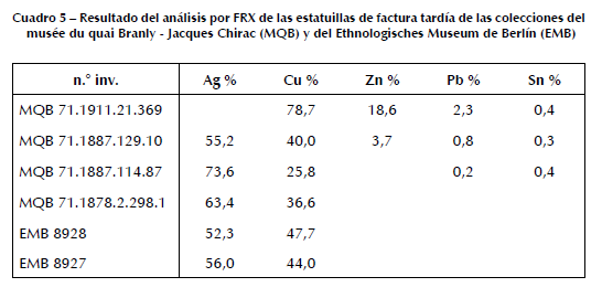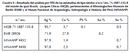La estatuilla del musée du quai Branly - Jacques Chirac ha sido elaborada a partir de una aleación que contiene un alto porcentaje de plata (cuadro 4), como las estatuillas incas de la región de Cuzco elaboradas por fundición y martillado mencionadas en Vetter Parodi & Guerra, en este volumen. Las dos estatuillas del mismo tipo conservadas en el MNAAHP también fueron analizadas por FRX con un equipo Thermo Scientific Niton modelo XL3T 950 GOLDD de Symtek en Perú. Su composición es próxima a la de la estatuilla del musée du quai Branly - Jacques Chirac, mientras que la estatuilla del Ethnologisches Museum de Berlín es claramente diferente (para los detalles analíticos, véase Guerra et al., en este volumen), lo que podría indicar una factura más reciente (véase planteo en Vetter & Guerra, en este volumen).