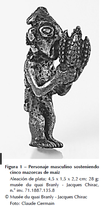 Las piezas de orfebrería atribuidas a los incas, o de influencia inca, destacan por el período remoto en que llegaron a Francia. El primer ingreso se registró en el musée du Louvre. En 1826 la institución adquiere 21 objetos americanos provenientes de la colección personal de Dominique-Vivant Denon1, puesta en venta luego de su fallecimiento (Riviale, 1996: 374). Entre las piezas se encuentra la estatuilla en miniatura de plata maciza (n.° inv. 71.1887.135.8) de un hombre que sostiene con sus manos cinco mazorcas de maíz (fig. 1). La pieza no se describe con precisión en el catálogo de venta redactado por J. J. Dubois, dibujante del departamento de las antigüedades egipcias del musée du Louvre. Se menciona: «Una estatuilla mexicana de plata», precisamente la única que puede corresponder a este objeto (Guimarães, 1994: 60). Es evidente que se perdió o que nunca se conoció la procedencia precisa de la estatuilla,de la que se sabe, sin embargo, que es americana.