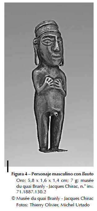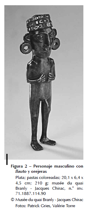 La estatuilla n.° inv. 71.1887.114.90 (fig. 2) es el único ejemplar conocido que luce las orejeras de la nobleza inca12. También es una pieza atípica por otros motivos,por ejemplo su gran tamaño (20,1 cm.) y peso (210 g.) en una pieza hueca, así como las incrustaciones coloreadas de materias desconocidas que decoran el llauto.