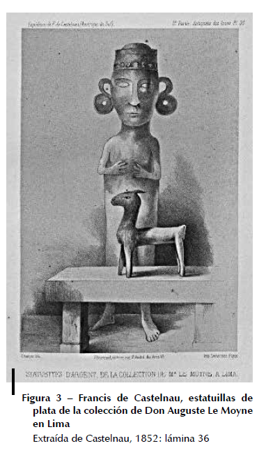 Años más tarde, en 1854, el fondo del musée du Louvre se enriquece con la adquisición de la colección del diplomático Auguste Lemoyne2, cónsul general de Francia en Lima de 1840 a 1849 (Riviale, 1996: 374): unas 200 piezas, entre las cuales se encuentran una estatuilla femenina maciza de bronce (n.° inv. 71.1887.114.87; dimensiones: 6,3 x 1,9 x 1,8 cm; peso: 79,4 g), con cabeza voluminosa, piernas unidas y volúmenes muy redondeados; una estatuilla de llama (hueca) de plata, a la cual le faltan tres pies y la cola (n.° inv. 71.1887.114.92; dimensiones: 6 x 4,6 x 1,3 cm; peso: 7,2 g) y, finalmente, una destacable estatuilla masculina (hueca) de plata con incrustaciones de pastas coloreadas (n.° inv. 71.1887.114.90). Esta última ha sido representada con ambas manos en el pecho, ataviada con orejeras y llauto (fig. 2). Destacable por su tamaño, sus grandes orejeras y su decoración colorida, la estatuilla ya había llamado la atención del francés Francis de Castelnau, quien realizó una expedición a América del Sur (1843-1847) y elaboró un bosquejo durante su visita a la colección Lemoyne en Lima (fig. 3; Castelnau, 1852: lám. 36): dibujada con cierta libertad, la estatuilla no presentaba las soldaduras groseras en la juntura de las piernas y los pies que hoy la caracterizan, sin que podamos tener la certeza de que estas reparaciones fueron realizadas después de esta fecha o que fueron voluntariamente omitidas por el dibujante. Única en su género, la estatuilla ha sido frecuentemente citada y reproducida (Jones, 1964: fig. 34; Lapiner, 1976: fig. 684; Levenson, ed., 1991: fig. 448) y, sin embargo, no ha sido estudiada. Se desconoce su procedencia, así como la del resto de la colección Lemoyne.