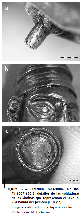 La estatuilla antropomorfa (n.° inv. 71.1887.130.2; fig. 4) representa a un noble inca con llauto, con las manos sobre el pecho. La observación con lupa binocular confirmó que fue realizada, como numerosas estatuillas de este tipo (Rowe, 1996: 302-309, fig. 107 y 108), a partir de láminas recortadas, repujadas y soldadas. Se representan el rostro, el torso y las piernas con una lámina repujada y enrollada hacia el interior y soldada a nivel de la espalda. La parte inferior de esta lámina fue recortada en dos y enrollada para formar las extremidades cilíndricas que representan las piernas.Luego, la lámina fue soldada en la cara interna. Para confeccionar los brazos y las manos, la lámina fue repujada y el detalle de los dedos fue mejorado por cincelado. Los pies fueron elaborados con láminas soldadas a las piernas;cuatro líneas groseramente cinceladas esbozan los dedos del pie. Se añadieron otras dos láminas para cubrir la cabeza y confeccionar el llauto o banda que la ciñe:una lámina, con forma de cinta, presenta líneas cinceladas en el contorno para crearla ilusión de que la banda está enrollada alrededor de la cabeza; la otra, circular,representa la parte superior de la cabeza (figs. 6c y 7b). Finalmente, ambas orejas fueron elaboradas a partir de un alambre de sección cuadrada que fue martillado en la parte superior para representar el lóbulo en repujado y, luego, soldado a la cabeza (fig. 7a). El sexo ha sido realizado de forma independiente a partir de una lámina enrollada y soldada. A su vez, esta fue nuevamente soldada a la estatuilla (fig. 6a).