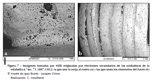 El análisis por FRX y MEB-EDS (cuadro 1) de diferentes elementos de la estatuilla revela no solamente la composición de las aleaciones empleadas en la fabricación de las láminas de oro, cuyo tenor en plata es muy elevado, sino también la utilización en el ensamblado de una soldadura cuya composición es más rica en cobre a fin de reducir el punto de fusión. La figura 7 muestra la imagen tomada con el MEB de la soldadura que une la oreja al rostro del personaje.