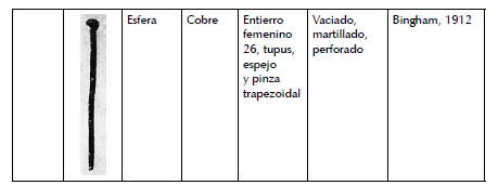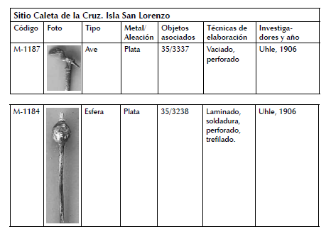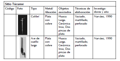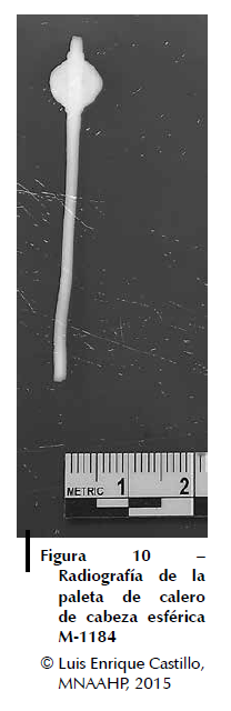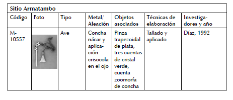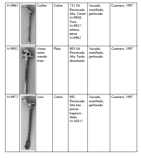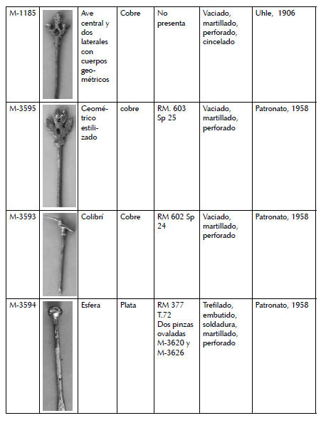 antropomorfas (M-6384) y geométricas (M-1183; M-1185; M-3595). Y otro, donde el proceso de manufactura combina las técnicas de trefilado, laminado, embutido, recortado y soldadura con las cuales los artesanos trabajaron las paletas de calero con cabeza esférica y de vástago cilíndrico (M-3594, M-1184) (figs. 9, 10).