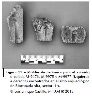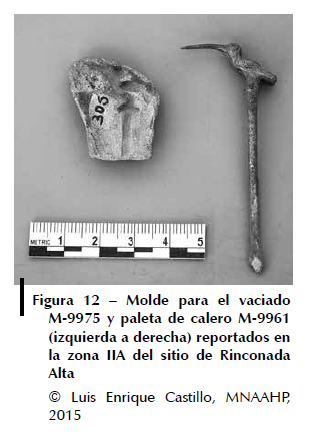 Uno de estos procesos orfebres consistió en utilizar moldes de arcilla para el vaciado o colada para verter el metal y formar la cabeza y el vástago de las paletas. Posteriormente los orfebres eliminaban los rebordes y el material sobrante mediante diferentes procesos de cortado, limado, pulido y retoque. En el sitio de Rinconada, en el sector II A, investigado por Daniel Guerrero, se reportaron moldes de cerámica para el vaciado o colada. Estos moldes muestran evidencia de uso, están incompletos y presentan oscurecimiento en los bordes. Uno de ellos presenta la impronta de un ave de pico largo (M-9975) y el otro muestra el vástago tubular con la impronta de una parte de figura ornitomorfa (M-9976). Las investigaciones de Vetter (2013) sobre el molde M-9975 evidencian el empleo de vaciado y de plata. Es posible que estos moldes se hayan utilizado para manufacturar las paletas de calero ornitomorfas que se reportaron en el sitio (figs. 11, 12).