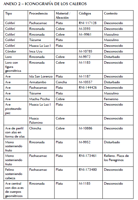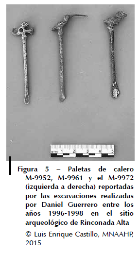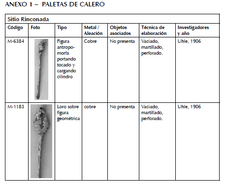 En el depósito de la colección de metales del Museo Nacional de Arqueología, Antropología e Historia del Perú (MNAAHP) se custodia una colección de paletas de calero obtenidas mediante investigaciones arqueológicas de los sitios de Rinconada, Isla San Lorenzo y Armatambo. Estos artefactos forman parte de esta investigación y su descripción se encuentra en el Anexo 1.