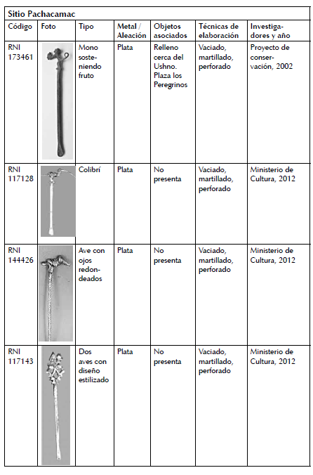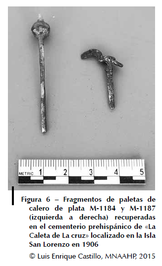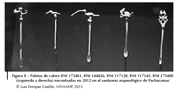 En la exposición de dicho museo de sitio se exhiben cinco paletas de calero de aleaciones de plata, procedentes del sitio arqueológico de Pachacamac (fig. 8).