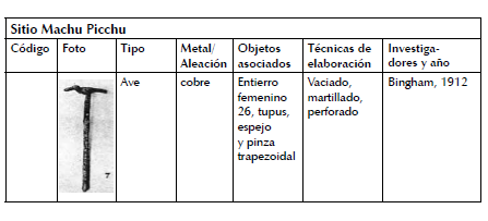 Las paletas de calero de Machu Picchu fueron elaboradas en aleación de cobre, una de ellas presenta una figura ornitomorfa en pleno vuelo y la otra presenta una cabeza esférica con vástago cilíndrico aguzado (muy similar a las reportadas por Uhle en Rinconada e Isla San Lorenzo).