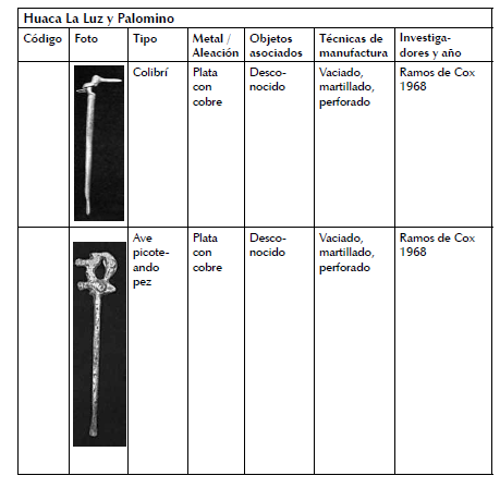 En la Huaca de La Luz I, se recuperó una paleta de calero con figura ornitomorfa de pico largo de cobre y otra de cabeza de ave picoteando un pez elaborado en aleación de plata y otra de cobre procedente de Huaca Palomino (Vetter, 2011: 233) .
