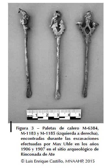 Las primeras excavaciones del lugar fueron efectuadas por Max Uhle en los años 1906 y 1907 con el fin de incrementar las colecciones del Museo de Historia Nacional. Logró obtener tres paletas de calero (M-1183; M-1185, M-6384) (fig. 3).