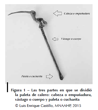 Este instrumento presenta una cucharita o paleta de forma ovalada que se asocia al uso de la cal en el consumo de la hoja de coca. Para una mejor comprensión, se ha dividido la paleta en tres partes: cabeza, vástago y paleta. La cabeza o empuñadura se ubica en la parte superior y presenta una iconografía variada. Se utilizaron de manera recurrente figuras ornitomorfas, donde las patas se posan sobre el vástago. El vástago o cuerpo es la zona que une la cabeza con la paleta. Por lo general tiene forma cilíndrica aunque tenemos casos de formas rectangulares. La paleta o cucharita, localizada en la parte inferior del vástago, presenta una terminación ovalada (fig. 1).