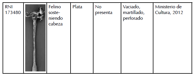 Dans un groupe d’objets provenant de mobiliers funéraires de la collection de métaux du Museo Nacional de Arqueología, Antropología e Historia del Perú (MNAAHP), nous avons identifié des spatules de chaulage, supposées être liées à la consommation de feuilles de coca. Ce travail a pour but la caractérisation des typologies, des alliages et des techniques de fabrication des pièces ainsi que la recherche d’un rapport entre ces caractéristiques et le genre des individus enterrés. Suite à une demande émise en 2014 par la direction du musée, un traitement de conservation a été réalisé sur les pièces pour qu’elles puissent être exposées.