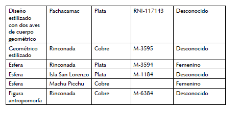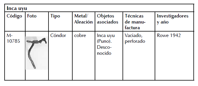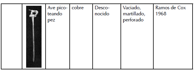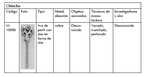 Lamentablemente no contamos con la información de campo de los caleros M-3593 (figura ornitomorfa, colibrí, elaborada en aleación de cobre) y M-3595(figura geométrica estilizada, elaborada en aleación de cobre) recuperados en la misma temporada del proyecto (fig. 4).
