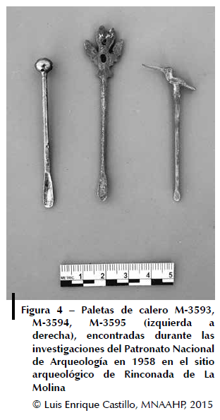 En contextos arqueológicos de los sitios de Rinconada, Isla San Lorenzo y Pachacamac reportaron un tipo de instrumento metálico llamado «paletas de calero» (Ministerio de Cultura, 2013: 66), «caleros» (Carcedo, 2000: 90-91), «cuchara para rape» (Carcedo & Vetter, 2002: 60) o «limpia oídos» (Eaton, 1990 [1916]: 19; Narváez, 1996: 105) que asocian al estilo incaico.