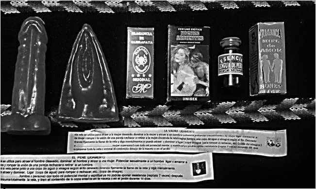 Entonces, si las mujeres pretenden no sentir placer en el momento de la relación sexual, ¿cómo explicar esta abundancia de objetos (fabricados tanto por mujeres como por hombres) que presentan atributos sexuales exagerados, de recetas (el «cardan caldito» de testículos de toro —también empleado contra la resaca— o también el consumo de mariscos), de polvos, de amuletos, de perfumes, de algunas plantas como la maca .Lepidium meyeni) conocida como el «Viagra andino», la papalisa, este pequeño tubérculo color fucsia y amarillo, de piedras, de lanas de colores, de perfumes con nombres intrigantes tales como Sígame, sígame o también de velas para exaltar la libido? (fig. 1). Estos artefactos se encuentran en La Paz, en la calle Sagarnaga (también conocida como «calle de las brujas») como en numerosos otros mercados del país, donde se venden en corredores enteros con olores y colores tan particulares.